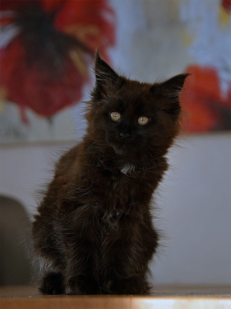 Olivia er DK*Coogan's Calebs halvsøster, og sammen med han og DK*Coogan's Neytiri representere disse det nære bindeleddet vi har til de første Maine Coonene som kom til Europa på 80-tallet. I de nærmeste generasjonene i hennes stamtavlen finnes det flere legendariske katter fra slutten av forrige århundre og begynneslen av dette. Vi er så beæret over å få mulighet til å jobbe videre med disse linjene i våre avkom.